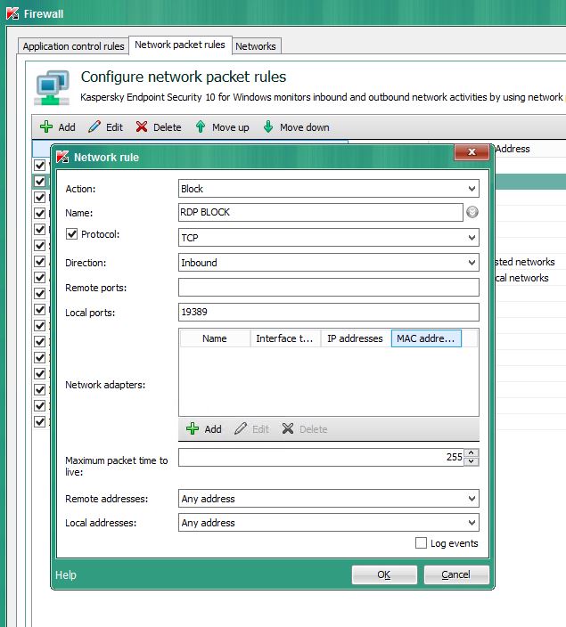 5. Add > Block > “description” > Protocol > Inbound > Local Port > OK > OK