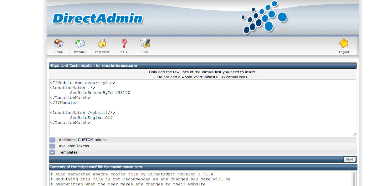 Next, login to DirectAdmin and go to “Extra Feature”. Choose “Custom HTTPD Configurations” and search for domain needed. Paste the line that you have copied earlier in the space given.