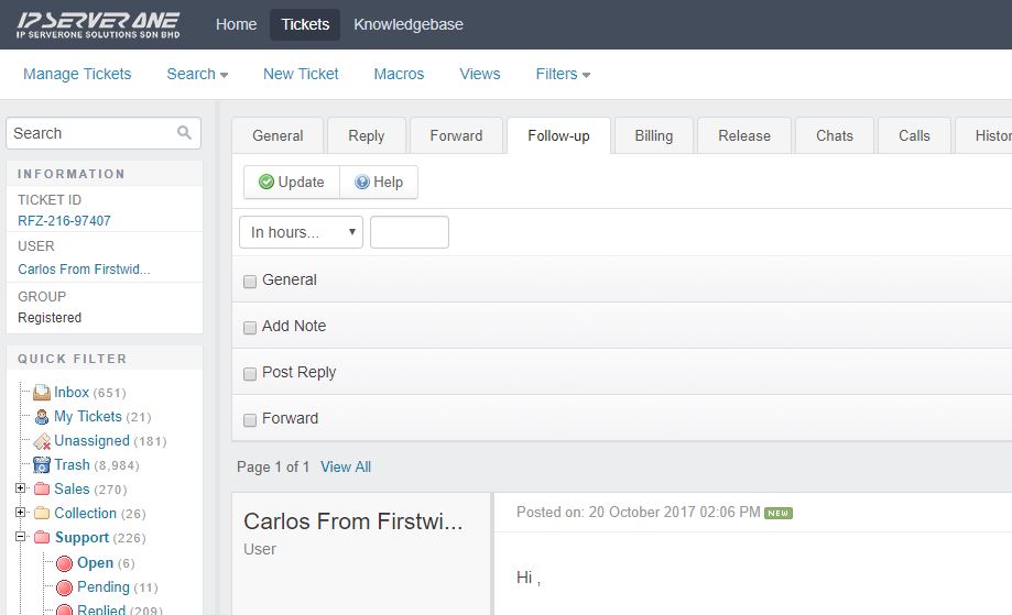 - You can set a follow-up from any support ticket’s ‘Follow-up‘ tab:
