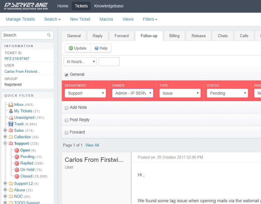 4. Select Department, assign Owner and select Status in where you want the ticket to pop-up, typically it must set to ‘Pending‘ first.